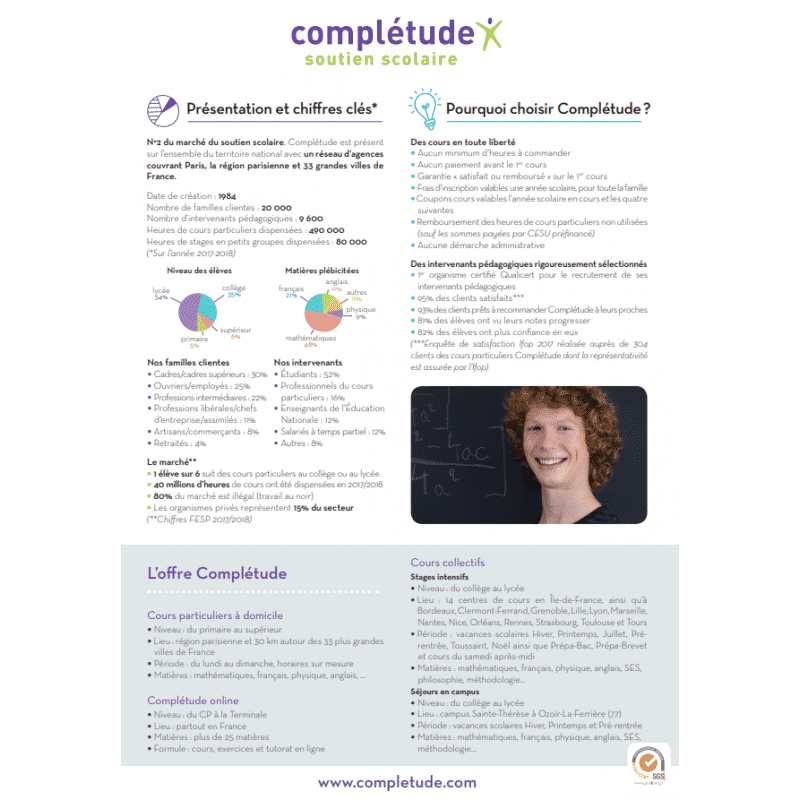 Complétude est un soutien scolaire pour vos enfants de la primaire au études supérieures. Cette enseigne est n°2 du marché du soutien scolaire et est présente sur l’ensemble du territoire national. Profitez de cours en toute liberté. Vous êtes libre sur le 1er cours, il est garantie satisfait ou remboursé